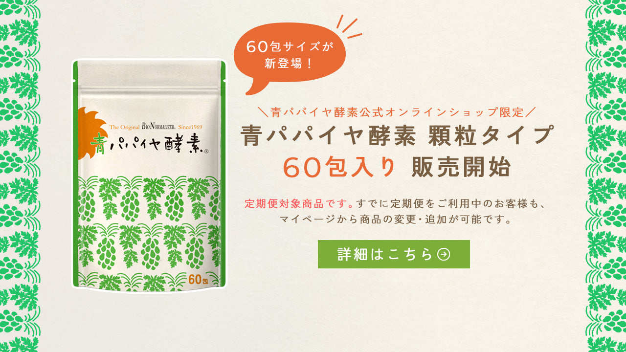 ※バイオ・ノーマライザーと青パパイヤ酵素の成分・内容は同様です。パッケージのみ異なります。